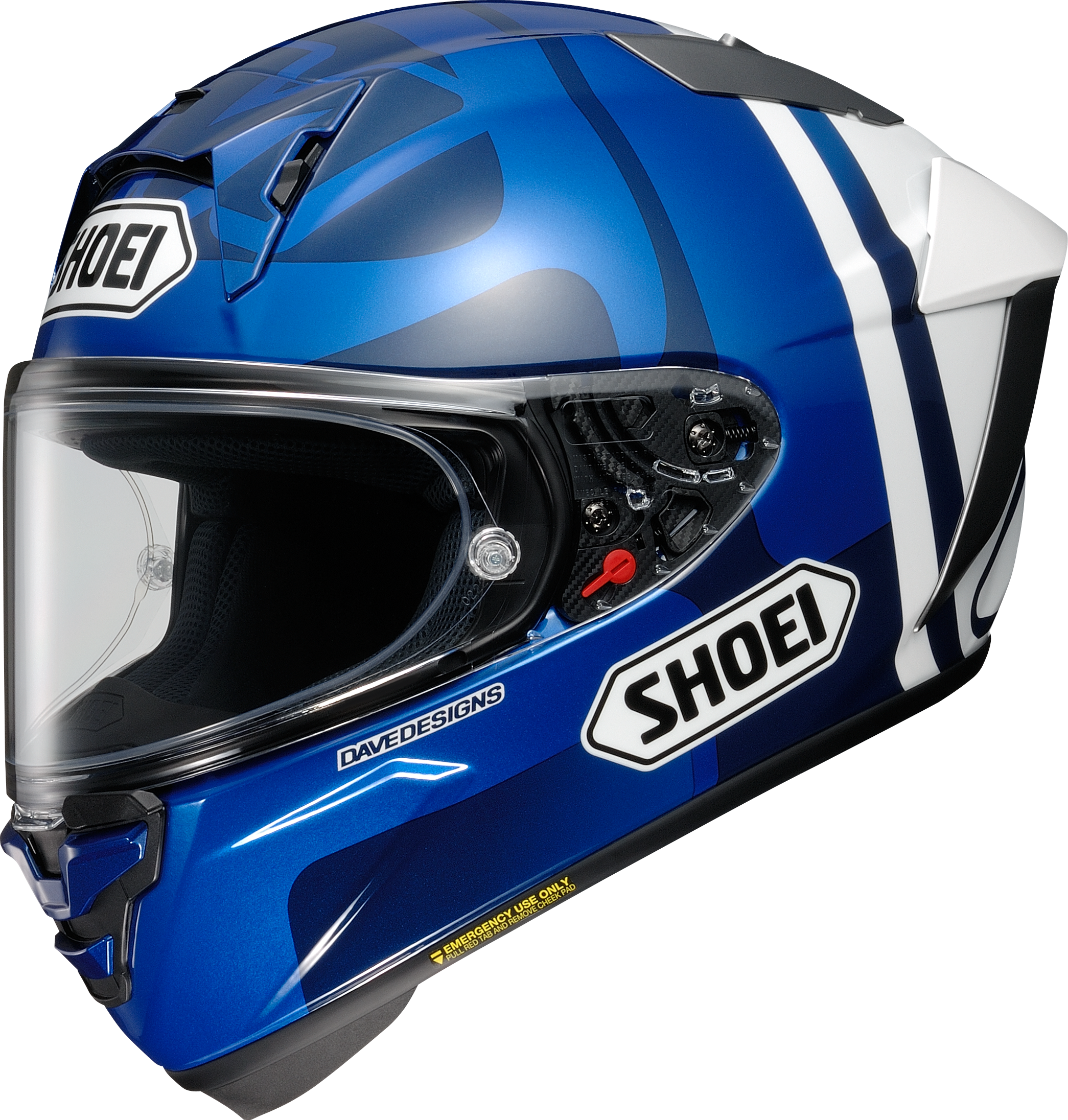 Invändigt sitter SHOEIs 3D Max-Dry inredning, helt uttagbar, tvättbar och designad för att hålla föraren torr och bekväm. Kinderna har ett låssystem som ger perfekt passform även under extrem acceleration, och för säkerhet finns EQRS (Emergency Quick Release System) så räddningspersonal snabbt kan avlägsna kindkuddarna.