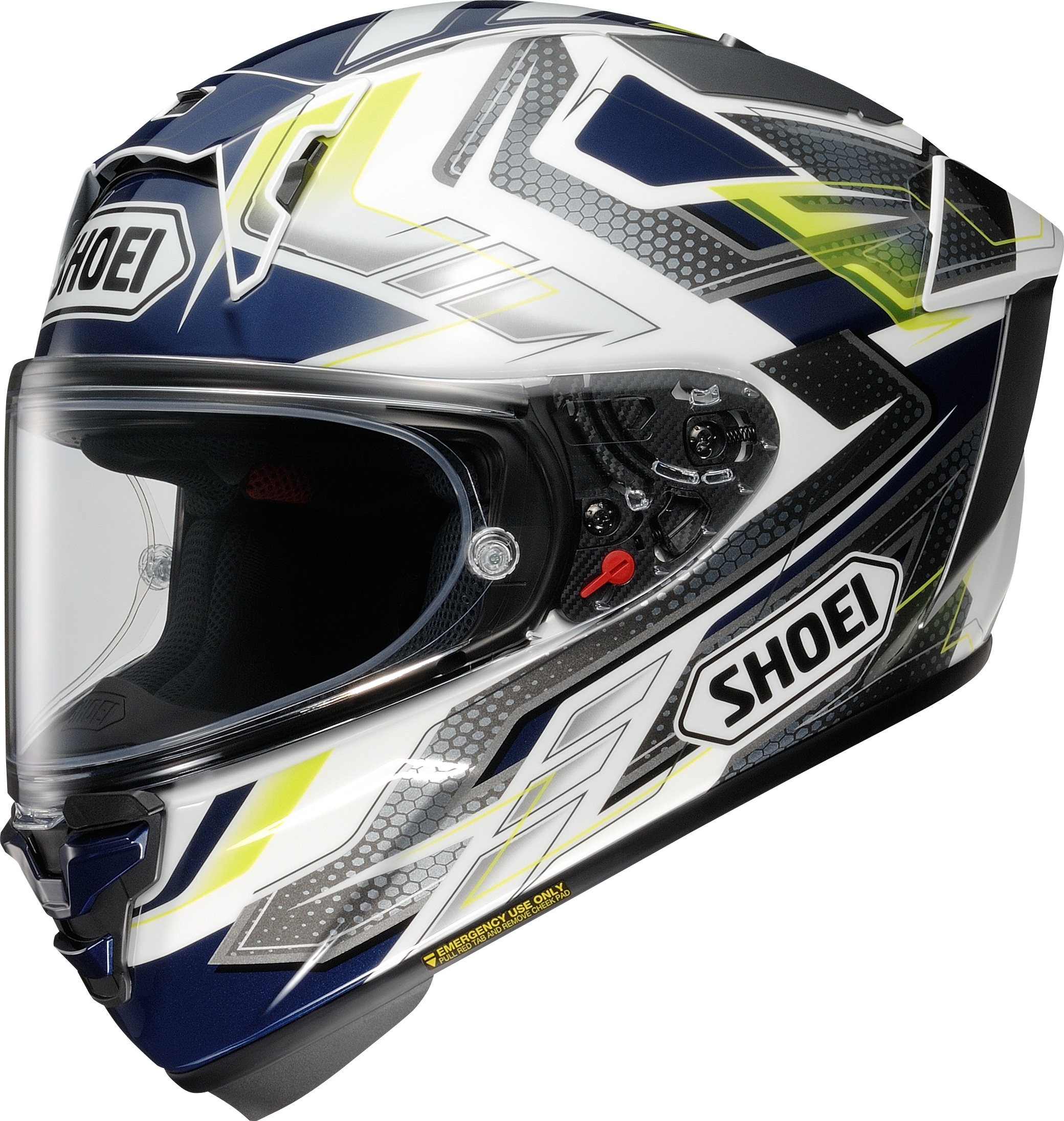 Invändigt sitter SHOEIs 3D Max-Dry inredning, helt uttagbar, tvättbar och designad för att hålla föraren torr och bekväm. Kinderna har ett låssystem som ger perfekt passform även under extrem acceleration, och för säkerhet finns EQRS (Emergency Quick Release System) så räddningspersonal snabbt kan avlägsna kindkuddarna.
